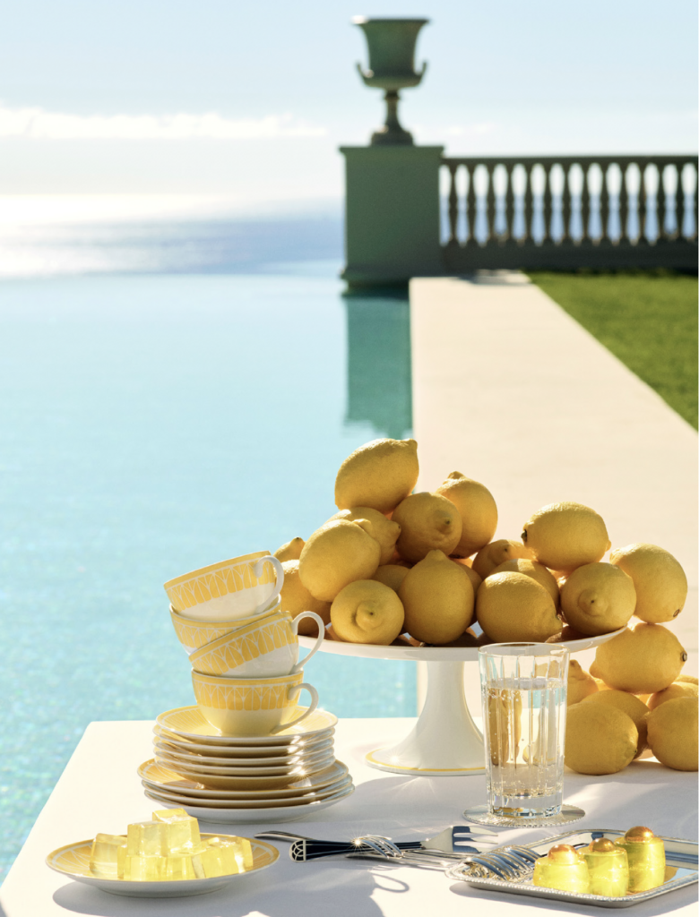 « Chaque pièce du service malmaison riviera semble capturer le soleil méditerranéen, grâce à un délicat jaune aquarellé, vibrant et naturel, venant réchauffer et illuminer la table ».